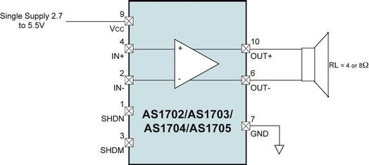 The AS1702, AS1703, AS1704, and AS1705 are singlechannel differential audio power-amplifiers designed to drive 4 and 8 Ohm loads. The integrated gain circuitry of these amplifiers and their small size make them ideal for 2.7- to 5V-powered portable audio devices.