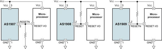The AS1907/AS1908/AS1909 microprocessor supervisory circuits are ideal for monitoring the supply voltage of digital systems and microprocessors.