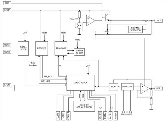 AS2702 regulates the nominal dc bus voltage of 30V internally down to 5V to supply it's internal circuitry including a 16 x 8 bits EEPROM, as well as down to a nominal supply level 24V with a max. loading of 50 mA for the actuators and sensors connected to it at the field side.