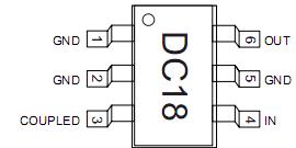 Features: *Low Cost*Low Profile*Available in Small SOT-6 Lead Package*Tape & ReelPinoutSpecifications Characteristic Value Input Power1 4.0 W CW Operating Temperature -40 to +85 Storage Temperature -65to +150 Electrostatic Discharge +125 VDescription The DC18-73 is a monolith...