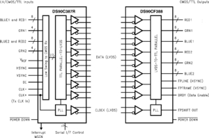 DS90C387R also comes with features that can be found on DS90C387. Cable drive is enhanced with a user selectable pre-emphasis feature that provides additional output current during transitions to counteract cable loading effects. DC Balancing on a cycle-to-cycle basis is also provided to reduce ISI( Inter-Symbol Interference), control signals ( VSYNC, HSYNC, DE) are sent during blanking intervals. With pre-emphasis and DC Balancing, a low distortion eye-pattern is provided at the receiver end of the cable. These enhancements allow cables 5 to 15+ meters in length to be driven depending on media characteristic and pixel clock speed. Pre-emphasis is available in both the DC Balanced and Non-DC Balanced modes. In the Non-DC Balanced mode backward compatibility with FPD-Link Receivers is obtained.
