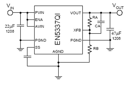 A complete power system-on-a-chip (PowerSoC), the EN5337QI integrates power switches, Inductor, gate drive, controller, and loop compensation in a tiny 4 mm x 7 mm package. The 1.85 mm profile and small footprint enables the use of this part where space is at a premium. The EN5337QI utilizes an external resistor divider to set the output voltage to any user defined value.