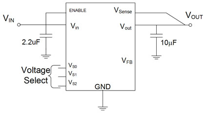 The EP5352QI utilizes a 3-pin VID output voltage selector that allows the designer to choose one of seven pre-defined output voltage levels; or an external voltage divider can be employed to set the output voltage.
