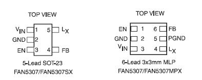 FAN5307: Features: • 95% Efficiency, Synchronous Operation• Adjustable Output Voltage Option from 0.7V to VIN• 2.5V to 5.5V Input Voltage Range• Customized Fixed Output Voltage Option...