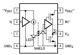Basic building blocks of the HCPL-0720 are a CMOS LED driver IC, a high speed LED and a CMOS detector IC. A CMOS logic input signal controls the LED driver IC which supplies current to the LED. The detector IC incorporates an integrated photodiode, a high-speed transimpedance amplifier, and a voltage comparator with an output driver.