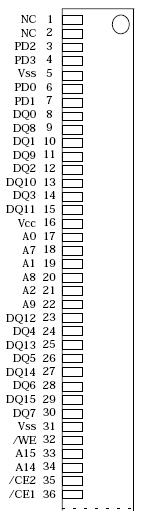 PD0 to PD3 identify the module HMS1M32M8V's density allowing interchangeable use of alternate density, industry- standard modules. Eight chip enable inputs, (/CE1, /CE2, /CE3 and /CE4) are used to enable the module's 4 bytes independently. Output enable (/OE) and write enable(/WE) can set the memory input and output.