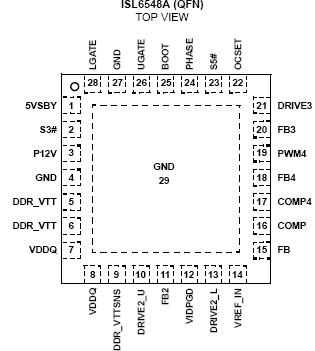 ISL6548A: Features: • Generates 5 Regulated Voltages- Synchronous Buck PWM Controller for DDR VDDQ- 3A Integrated Sink/Source Linear Regulator with Accurate VDDQ/2 Divider Reference for DDR VTT- PWM Reg...