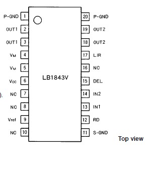 LB1843V: Features: Output current limiter and detector built in Low-saturation voltage bidirectional bridge circuit built in:VOsat = 0.40 V typ. at 400 mA Practically no current drain (0.1 A or less) in stan...