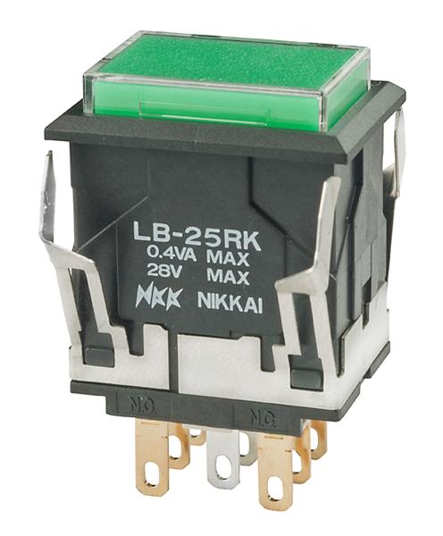 LB25RKG01-28-JF-RO: Pushbutton Switches DPDT ON(ON) RECT 28V LAMP CLEAR/GREEN CAP