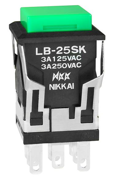 LB25SKW01-F: Pushbutton Switches DPDT ON-(ON) BLACK SQUARE GREEN CAP