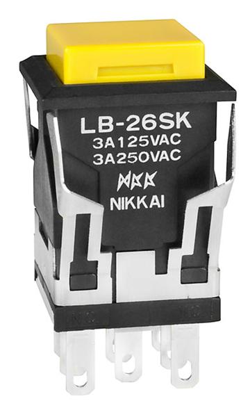 LB26SKW01-E: Pushbutton Switches DPDT ON-ON BLACK SQUARE YELLOW CAP