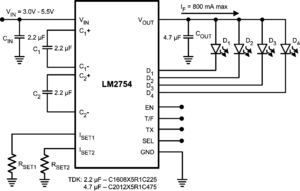 The LM2754 is an integrated low noise, high current switched capacitor DC/DC converter with four regulated current sinks. The device is optimized for driving 1 to 4 high power white LEDs in parallel with a maximum current of 800mA. Maximum efficiency is achieved over the input voltage range by actively selecting the proper gain based on the LED forward voltage and current requirements.