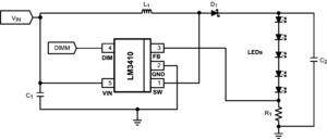 LM3410: PinoutSpecificationsTopologyBoost LED DriverInput Min Voltage2.6 VoltInput Max Voltage5.5 VoltOutput RangeVin to 24VOutput Current1500 mAEfficiency (peak)90 %Output Min3 VoltOutput Max24 VoltSpecial...
