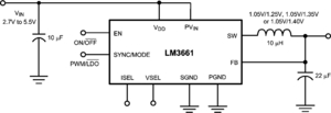 LM3661: PinoutSpecificationsOutput Current450 mAInput Min Voltage2.7 VoltInput Max Voltage5.5 VoltOutput Min1.05 VoltOutput Max1.35, 1.4 VoltFrequency Min600 kHzFrequency Max600 kHzEfficiency (peak)92 %On/O...
