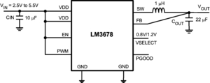 The LM3678 step-down DC-DC converter is optimized for powering low voltage circuits from a single Li-Ion cell battery and input voltage rails from 2.5V to 5.5V. It provides up to 1.5A load current, over the entire input voltage range. LM3678 offers a 0.8V/1.2V option. One of the pair of voltages is set through the VSELECT pin.