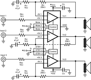 Each amplifier of the LM4782 has an independent smooth transition fade-in/out mute and a power conserving standby mode. The mute and standby modes can be controlled by external logic.
