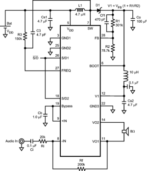 The LM4804 integrates a Boost Converter with an Audio Power Amplifier to drive voice coil speakers in portable applications. When powered by a 3V supply, it is capable of creating 1.8W power dissipation in an 8 bridge-tied-load (BTL) with less than 1% THD+N.