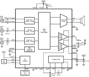 The LM49100 has three input channels. One pair of SE inputs can be used with a stereo signal. The other input channel is fully differential and may be used with a mono input signal. The LM49100 features a 32-step digital volume control and ten distinct output modes. The mixer, volume control, and device mode select are controlled through an I
