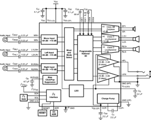 For improved noise immunity, the LM49250 features fully differential left, right and mono inputs. The three inputs can be mixed/multiplexed to any output combination of the loudspeaker, headphone or earpiece amplifiers. The left and right differential inputs can be used as separate single-ended inputs, mixing multiple stereo audio sources. The mixer, volume control, and device mode select are controlled through an I