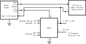 The LM76 is a digital temperature sensor and thermal window comparator with an I2C™ Serial Bus interface with an accuracy of ±1°C. This accuracy for the LM76CHM is specified for a -10°C to 45°C temperature range, while for the LM76CNM the temperature range is 70°C to 100°C. The LM76CHM is specified with an accuracy ±0.5°C at 25°C. The window-comparator architecture of the LM76 eases the design of temperature control systems conforming to the ACPI (Advanced Configuration and Power Interface) specification for personal computers. The open-drain Interrupt (INT) output becomes active whenever temperature goes outside a programmable window, while a separate Critical Temperature Alarm (T_CRIT_A) output becomes active when the temperature exceeds a programmable critical limit. The INT output can operate in either a comparator or event mode, while the T_CRIT_A output operates in comparator mode only.