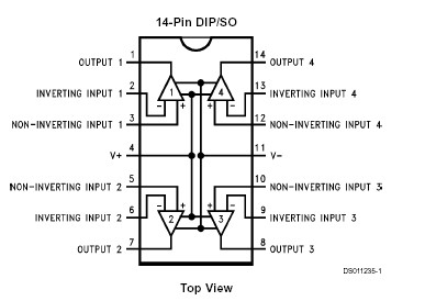 The LMC6024 is a CMOS quad operational amplifier which can operate from either a single supply or dual supplies. Its performance features include an input common-mode range that reaches V-, low input bias current and voltage gain (into 100 k and 5 k loads) that is equal to or better than widely accepted bipolar equivalents, while the power supply requirement is less than 1 mW.