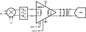 The LMH6515 is a high performance, digitally controlled variable gain amplifier (DVGA). It combines precision gain control with a low noise, ultra-linear, differential amplifier. Typically, the LMH6515 drives a high performance ADC in a broad range of mixed signal and digital communication applications such as mobile radio and cellular base stations where automatic gain control (AGC) is required to increase system dynamic range. When used in conjunction with a high speed ADC, system dynamic range can be extended by up to 32 dB.