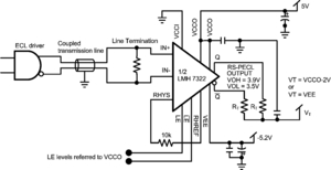 The LMH7322 is a dual comparator with 700 ps propagation delay, low dispersion of 75 ps and an input voltage range that extends from VCC-1.5V to VEE. The devices can be operated from a wide supply voltage range of 2.7V to 12V. The adjustable hysteresis adds flexibility and prevents oscillations. Both the outputs and latch inputs of the LMH7322 are RSPECL compatible. When used in combination with a VCCO supply voltage of 2.5V the outputs have LVDS compatible levels.