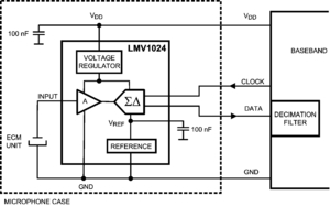 LMV1024: PinoutSpecificationsSNR59 dBNoise A-Wt-89 dBVAmp Gain15.5 dBInterfacePDM out serial bit streamSupply Current Per Channel0.5 mASupply Min1.6 VoltSupply Max3 VoltSpecial FeaturesHigh Quality AudioTemp...