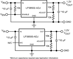 National's FlexCap LDO's feature unique compensation that allows the use of any type of output capacitor with no limits on minimum or maximum ESR. The LP38502-ADJ series of low-dropout linear regulators operates from a +2.7V to +5.5V input supply. These ultra low dropout linear regulators respond very quickly to step changes in load, which makes them suitable for low voltage microprocessor applications. Developed on a CMOS process, (utilizing a PMOS pass transistor), the LP38502-ADJ has low quiescent current that changes little with load current.