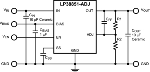 The LP38851-ADJ is a high current, fast response regulator which can maintain output voltage regulation with extremely low input to output voltage drop. Fabricated on a CMOS process, the device operates from two input voltages: VBIAS provides voltage to drive the gate of the N-MOS power transistor, while VIN is the input voltage which supplies power to the load. The use of an external bias rail allows the part to operate from ultra low VIN voltages. Unlike bipolar regulators, the CMOS architecture consumes extremely low quiescent current at any output load current. The use of an N-MOS power transistor results in wide bandwidth, yet minimum external capacitance is required to maintain loop stability.