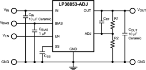 The LP38853-ADJ is a high current, fast response regulator which can maintain output voltage regulation with extremely low input to output voltage drop. Fabricated on a CMOS process, the device operates from two input voltages: VBIAS provides voltage to drive the gate of the N-MOS power transistor, while VIN is the input voltage which supplies power to the load. The use of an external bias rail allows the part to operate from ultra low VIN voltages. Unlike bipolar regulators, the CMOS architecture consumes extremely low quiescent current at any output load current. The use of an N-MOS power transistor results in wide bandwidth, yet minimum external capacitance is required to maintain loop stability.