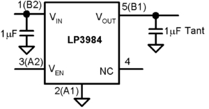 The device is ideal for mobile phone and similar battery powered wireless applications. It provides up to 150 mA from a 2.5V to 6V input. The LP3984 consumes less than 1.2µA in disable mode and has fast turn-on time less than 20µs.