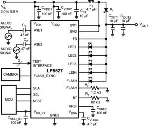 The LP5527 has an integrated 400 mA flash driver with a safety stop feature and 50 mA torch mode. An external enable pin is provided for the synchronizing the flash with the camera action. An external software independent test interface provides a fast way to find a broken path or short on LED circuits. Very small microSMD package together with minimum number of external components is a best fit for handheld devices.