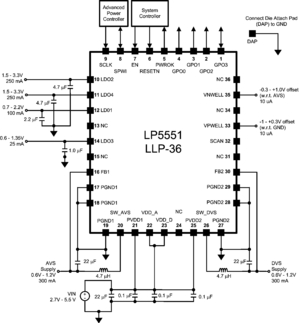 The device is controlled via the PWI open-standard interface. The LP5551 operates cooperatively with PowerWise™ technology compatible processors to optimize supply voltages adaptively over process and temperature variations or dynamically using frequency/voltage pre-characterized look-up tables and provides P- and N-well biasing for threshold scaling.