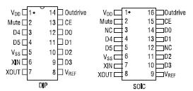 The M-991 is a call progress tone generator integrated circuit for use in telephone systems. The circuit uses low-power CMOS techniques to generate tones which are digitally controlled and highly linear. The M-991 is designed to permit operation with almost any system. The use of integrated circuit techniques allows the M- 991 to incorporate the control, tone generating, and power output buffer into a single 14-pin DIP or a 16-pin SOIC. A 3.58-MHz (color burst) crystal-controlled time base guarantees accuracy and repeatability.