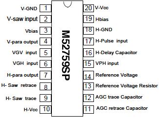 M52759SP: Features: • It can control phase of horizontal wave.• It can changes the parabola wave unbalance .• It contains the horizontal saw wave generator and Auto Gain Control circuit , so...