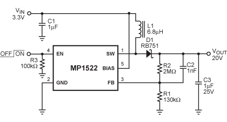 MP1522: PinoutDescriptionThe MP1522 is a step up converter that generates up to a 25V output voltage from a 2.7V to 25V input. It uses a current limited Variable Frequency control algorithm to optimize effi...