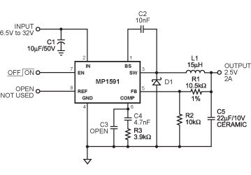 PinoutDescriptionThe MP1591 is a high voltage step-down converter ideal for automotive power adapter battery chargers. MP1591's wide 6.5V to 32V input voltage range covers the automotive battery's requirements and it achieves 2A continuous output for quick charge capability.Current mode operation ...