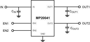 PinoutDescriptionThe MP20041 is a dual-channel, micropower, ultra low noise, low dropout and high PSRR linear regulator. The output voltage ofit ranges from 1.2V to 3.6V in 100mV increments and 1% accuracy by operating from a +2.5V to +6.0V input. The MP20041 can supply up to 300mA of load current...