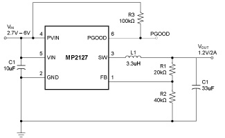 MP2127: PinoutDescriptionThe MP2127 is a fully integrated, internally compensated 1.2MHz fixed frequency PWM step-down converter. It is ideal for powering portable equipment that runs from a single cell Lit...