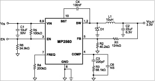 MP2560: PinoutDescriptionThe MP2560 is a high frequency step-down switching regulator with an integrated internal high-side high voltage power MOSFET. It provides 2.5A output with current mode control for f...