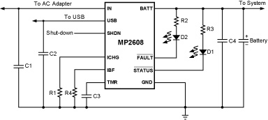 MP2608: PinoutDescriptionThe MP2608 is a dual-input, linear, high performance low-cost single cell Li-Ion or Li-Polymer battery charger. It accepts two power inputs, one from a USB (Universal BUS) port and ...