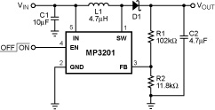 PinoutDescriptionThe MP3201 is a constant frequency, 5-pin TSOT23 current mode step up converter intended for small, low power applications. The switches at 1.1MHz and allows the use of tiny, low cost capacitors and inductors 2mm or less in height. Internal soft start results in small inrush curre...