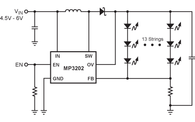 MP3202: PinoutDescriptionThe MP3302 is a step-up converter designed for driving up to 27 white LEDs, 3 WLEDs in series 9 strings, all from a single cell Lithium Ion battery. The MP3302 uses current mode, fi...
