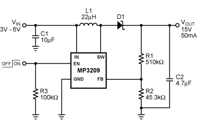 MP3208: PinoutDescriptionThe MP3208 is a 5-pin TSOT23 step-up converter designed for driving up to six (6) series white LEDs from a single-cell Lithium Ion battery. The MP3208 uses a current limited, variab...