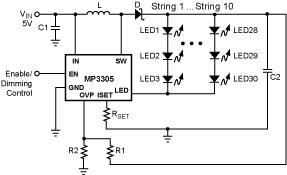 PinoutDescriptionThe MP3305 is a monolithic step-up converter designed for driving arrays of WLEDs from 5V input or a single cell Lithium Ion battery. The MP3305 uses current mode, fixed frequency architecture to regulate the LED current, which is measured through an external current sense resisto...