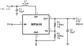 MP3410: PinoutDescriptionThe MP3410 is a highly efficient, synchronous, fixed frequency, current-mode step-up converter with output to input disconnect, inrush current limiting and internal soft-start. It i...