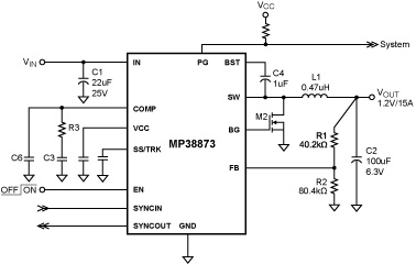 MP38873: PinoutDescriptionThe MP38873 is a monolithic step-down switch mode converter with a built in internal power MOSFET. It achieves 15A continuous output current over a wide input supply range with exce...