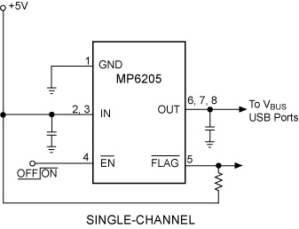 MP6205: PinoutDescriptionThe MP6205 Power Distribution Switch features internal current limiting to prevent damage to host devices due to faulty load conditions. The MP6205 Analog switch features 90mΩ...