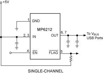 MP6211/MP6212: PinoutDescriptionThe MP6211/MP6212 single-channel Power Distribution Switch features internal current limiting to prevent damage to host devices due to faulty load conditions. The MP6211/MP6212 Anal...